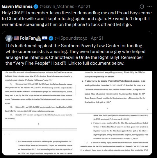 This morning the SLPC released a statement about a DOJ investigation into their use of paid informants. It was obvious the SPLC was trying to get ahead of the story, but it turns out they weren't that far ahead. This afternoon FBI Director Kash Patel and Acting AG Todd Blanche announced an 11-count indictment against the SPLC, accusing the group of funding some of the very hate groups they claimed to be fighting.QuoteThe Southern Poverty Law Center was indicted Tuesday on federal fraud charges alleging it improperly raised millions of dollars to pay informants to infiltrate the Ku Klux Klan and other extremist groups, acting Attorney General Todd Blanche said.The civil rights group faces charges including wire fraud, bank fraud and conspiracy to commit money laundering in the case brought by the Justice Department in Alabama, where the organization is based...Blanche said the SPLC paid at least $3 million between 2014 and 2023 to people affiliated with the Ku Klux Klan, the United Klans of America, the National Socialist Party of America and other extremist groups.Blanche offered a specific example of the funding, saying the SPLC had paid more than a quarter million dollars to one of the organizers of the Unite the Right rally.