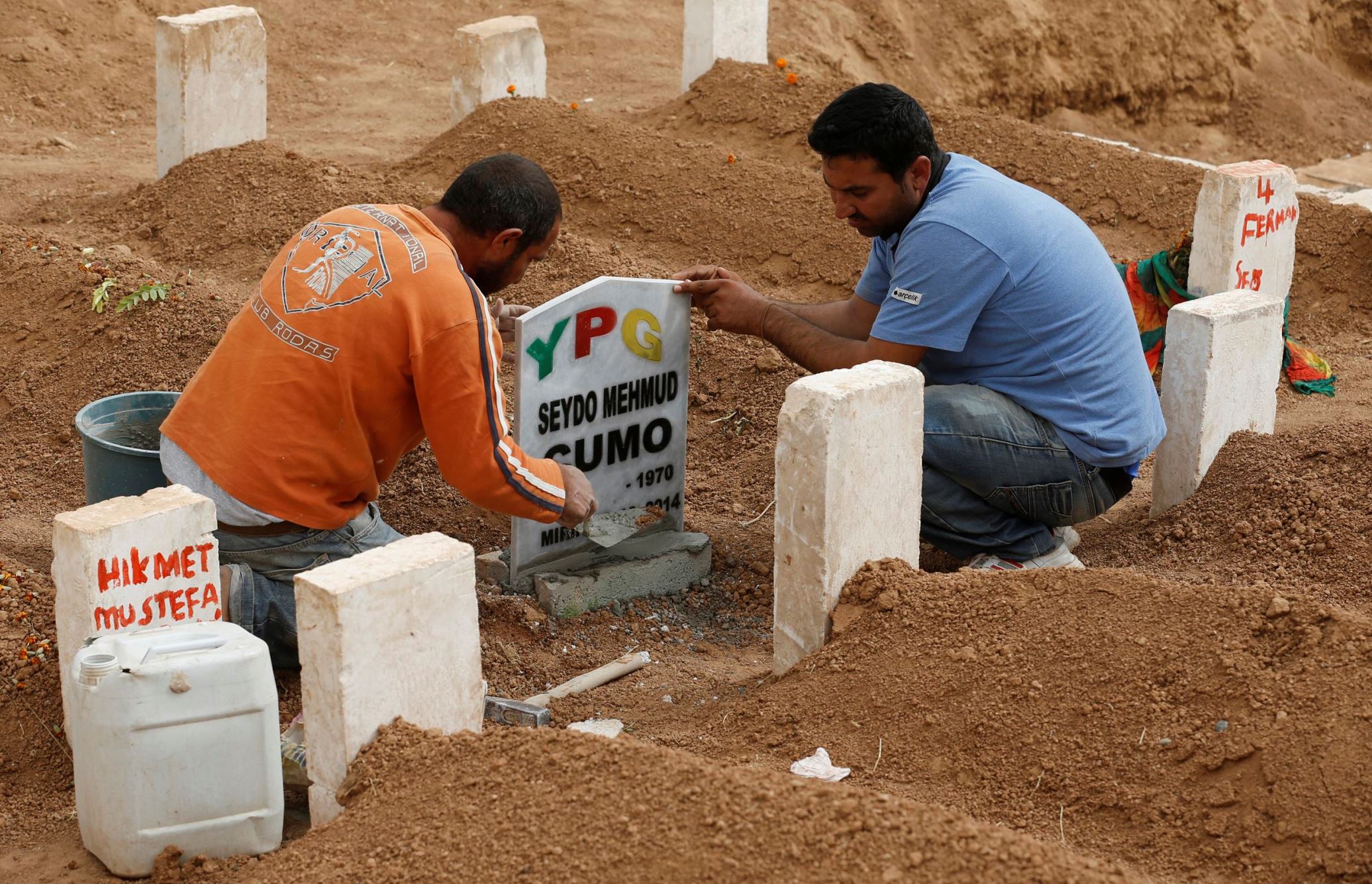 Men place the grave stone for a fallen Kurdish fighter, killed during clashes with ISIS in Syria, Oct. 11, 2014.