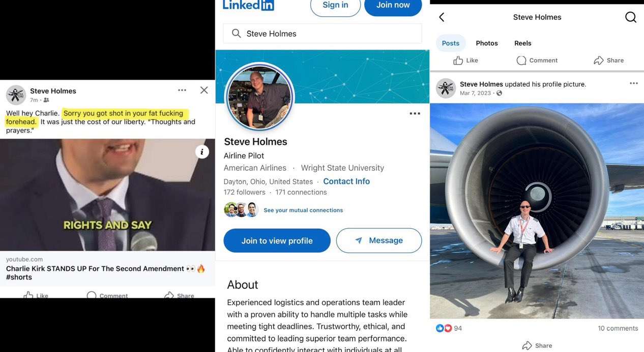 Steve Holmes, a pilot for American Airlines, says he is sorry Charlie Kirk got shot “in your fat ****ing face,” mocking his death as “the cost of our liberty.”